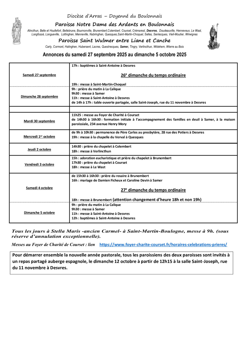 de 9h à 10h30 : permanence de Père Carlos au presbytère, 28 rue des Potiers à Desvres 19h : messe à la chapelle du Verval à Quesques |