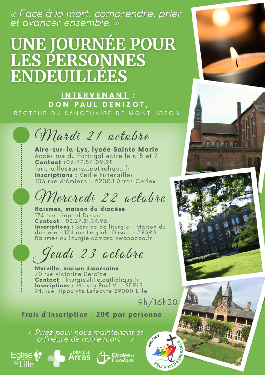 11h25 : messe au Foyer de Charité à Courset de 14h30 à 16h30 : formation initiale à l’accompagnement des familles en deuil à Samer, à la maison paroissiale, 234 avenue Henry Mory |