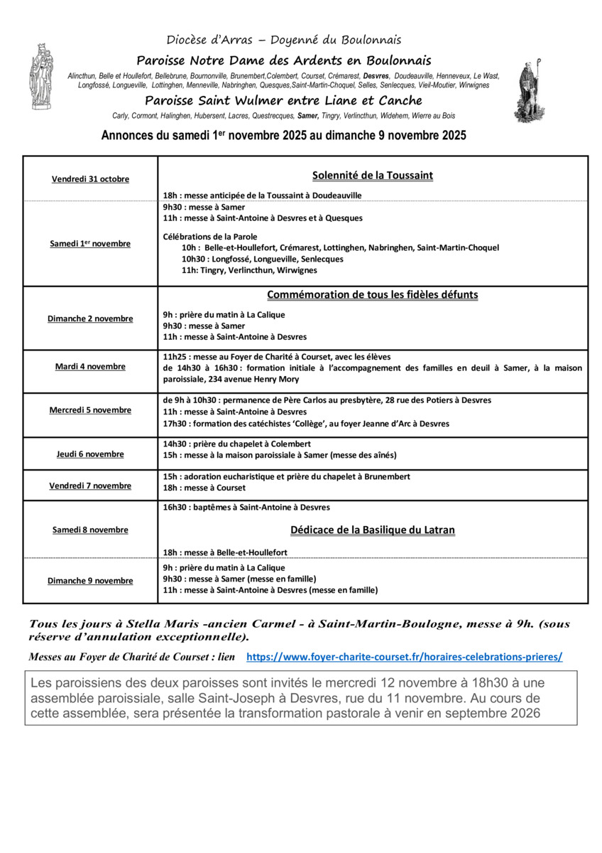 Célébrations de la Parole 10h : Belle-et-Houllefort, Crémarest, Lottinghen, Nabringhen, Saint-Martin-Choquel 10h30 : Longfossé, Longueville, Senlecques 11h: Tingry, Verlincthun, Wirwignes |