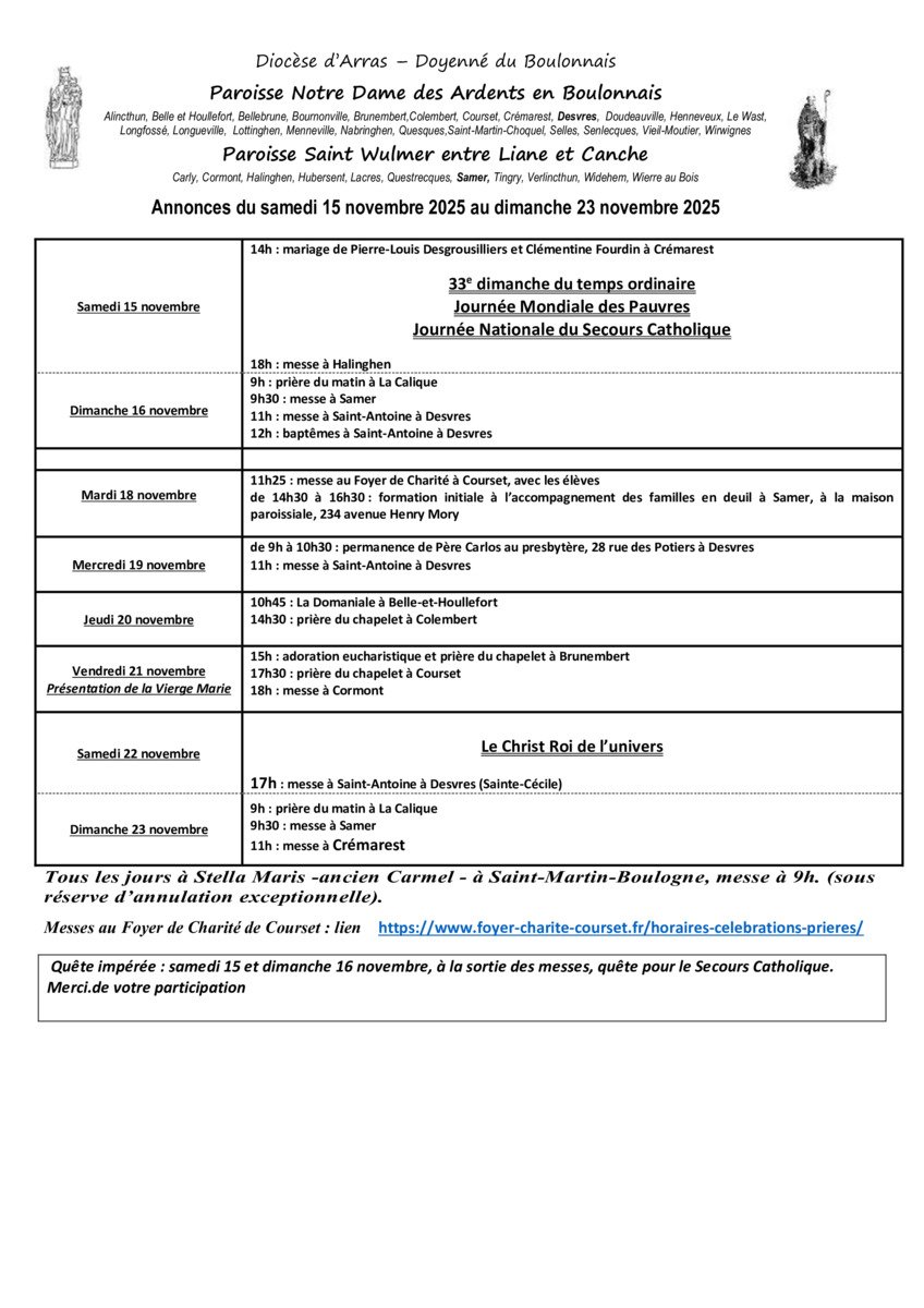 9h : prière du matin à La Calique 9h30 : messe à Samer 11h : messe à Crémarest |