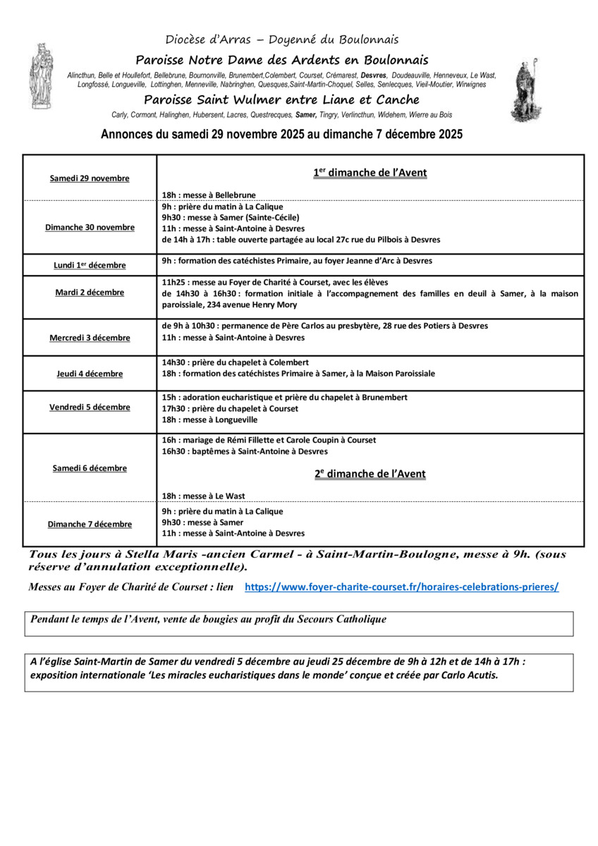 9h : prière du matin à La Calique 9h30 : messe à Samer 11h : messe à Saint-Antoine à Desvres |
