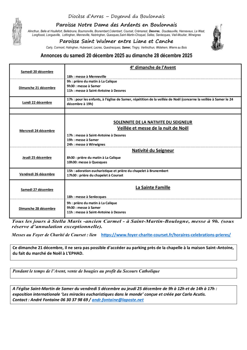 17h : messe à Saint-Antoine à Desvres 19h : messe à Samer 24h : messe à Wirwignes |
