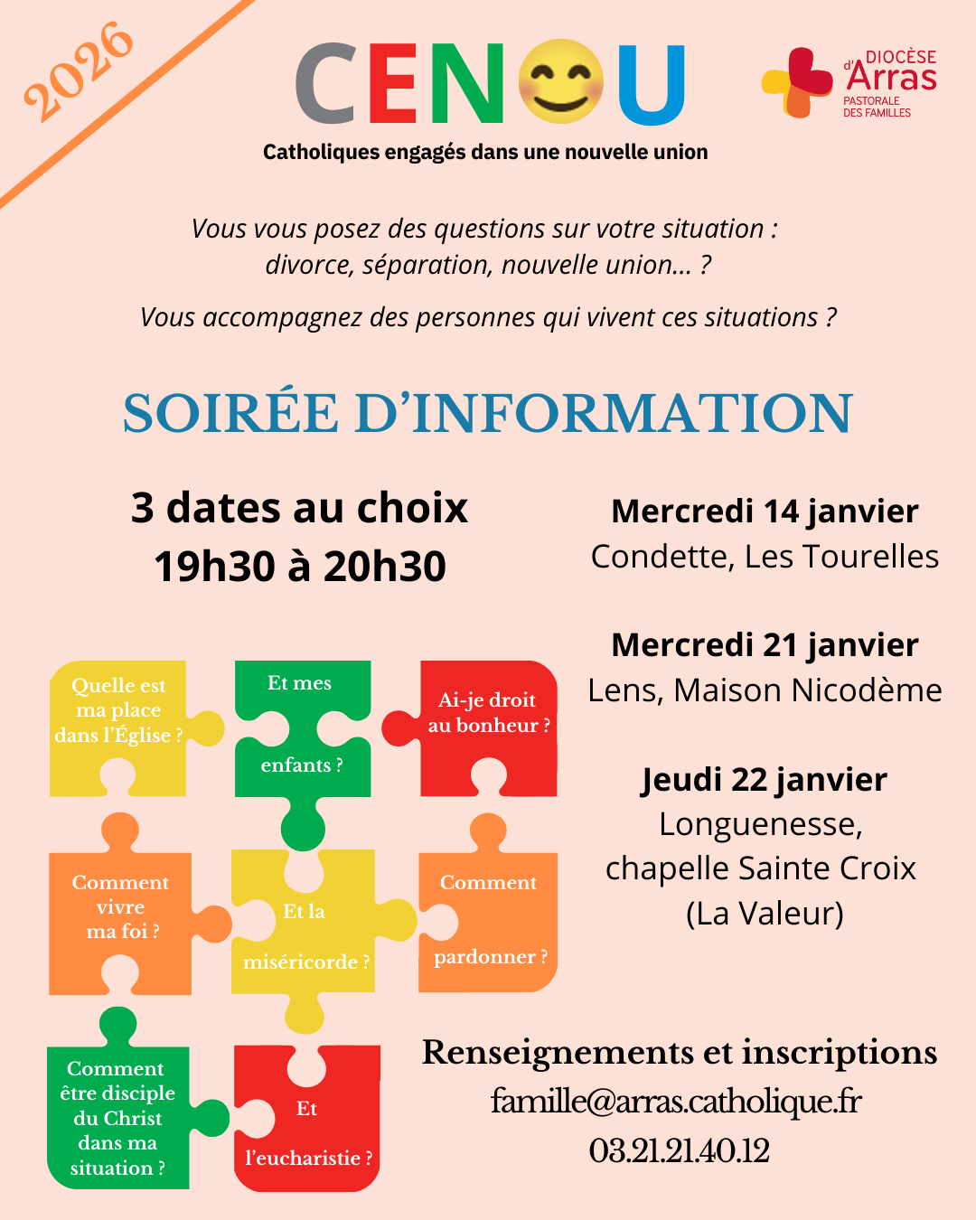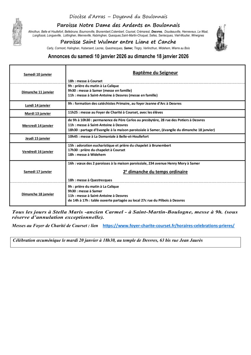 de 9h à 10h30 : permanence de Père Carlos au presbytère, 28 rue des Potiers à Desvres 11h : messe à Saint-Antoine à Desvres 18h30 : partage d’Evangile à la maison paroissiale à Samer, (évangile du dimanche 18 janvier) |