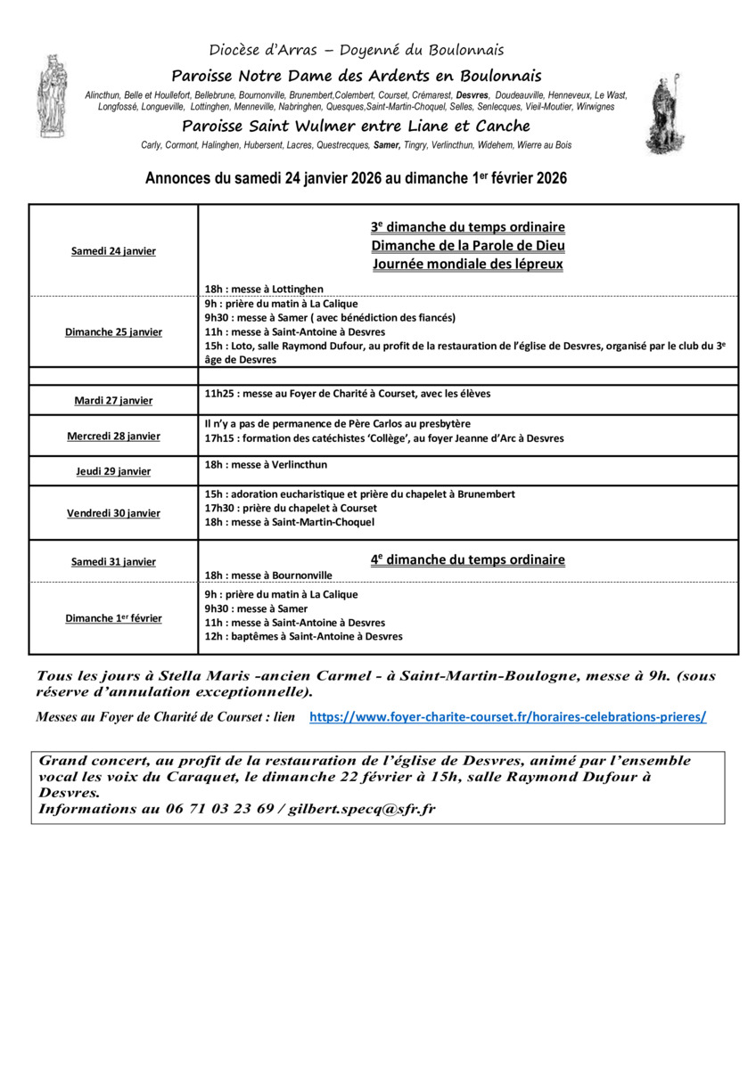 9h : prière du matin à La Calique 9h30 : messe à Samer ( avec bénédiction des fiancés) 11h : messe à Saint-Antoine à Desvres 15h : Loto, salle Raymond Dufour, au profit de la restauration de l’église de Desvres, organisé par le club du 3e âge de Desvres |