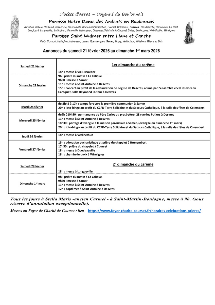 15h : adoration eucharistique et prière du chapelet à Brunembert 17h30 : prière du chapelet à Courset 18h : messe à Doudeauville 18h : chemin de croix à Wirwignes |
