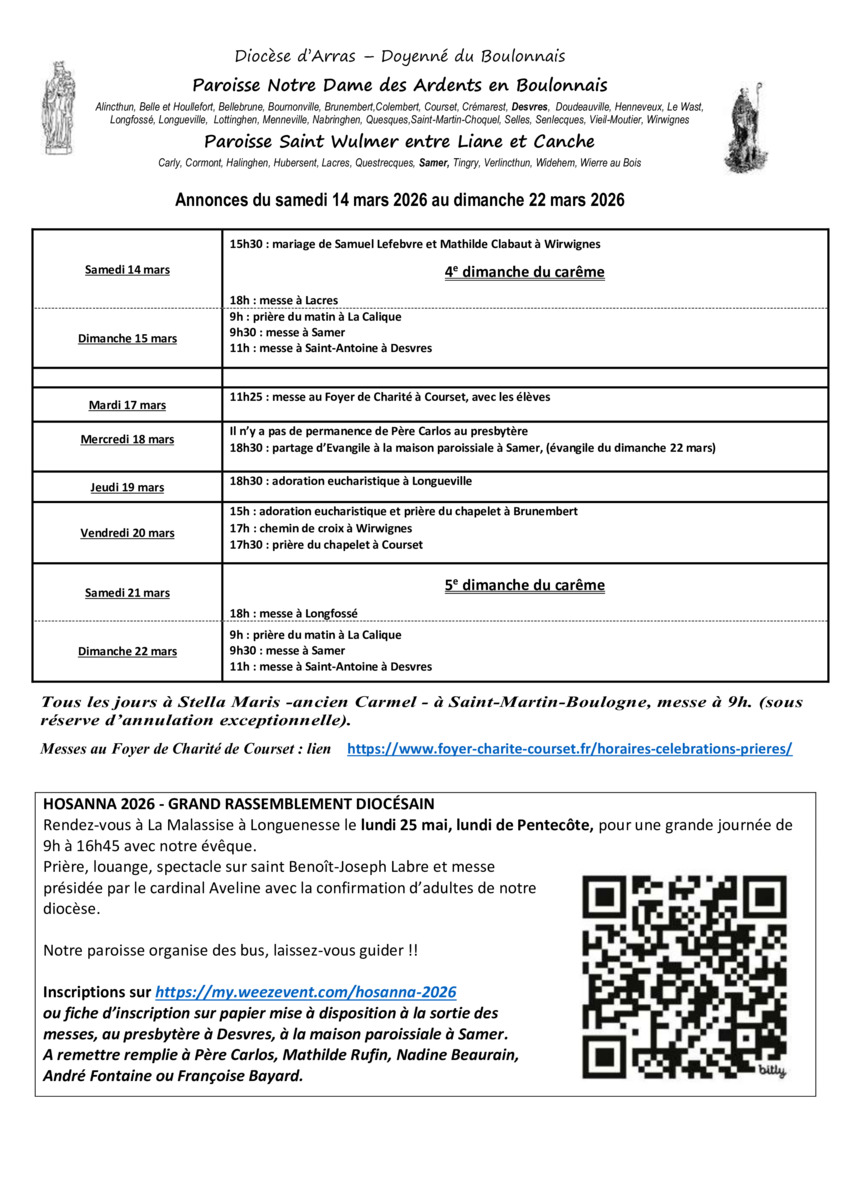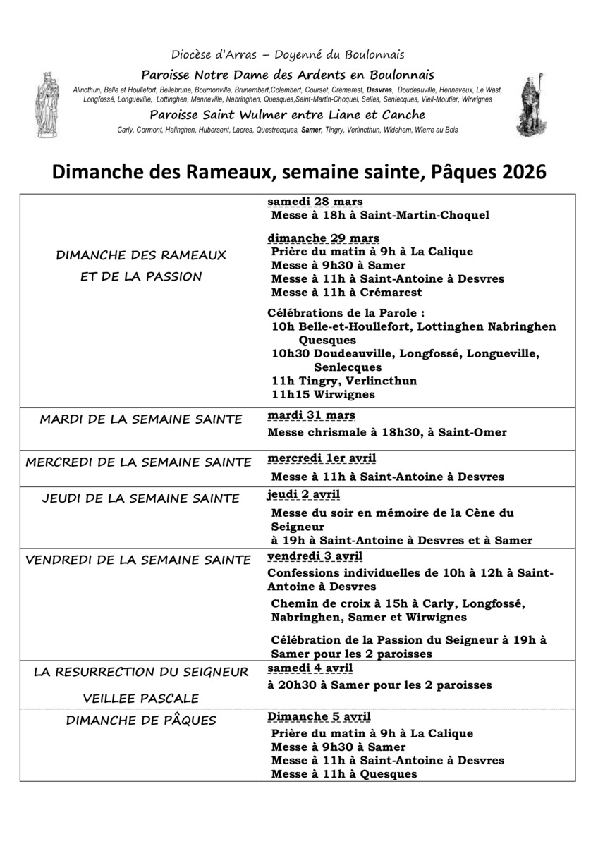 9h : prière du matin à La Calique 9h30 : messe à Samer 11h : messe à Saint-Antoine à Desvres |
