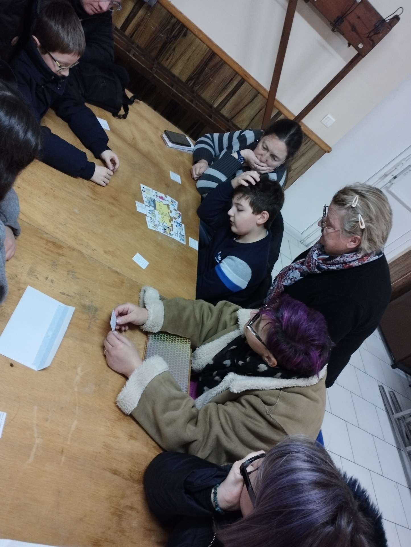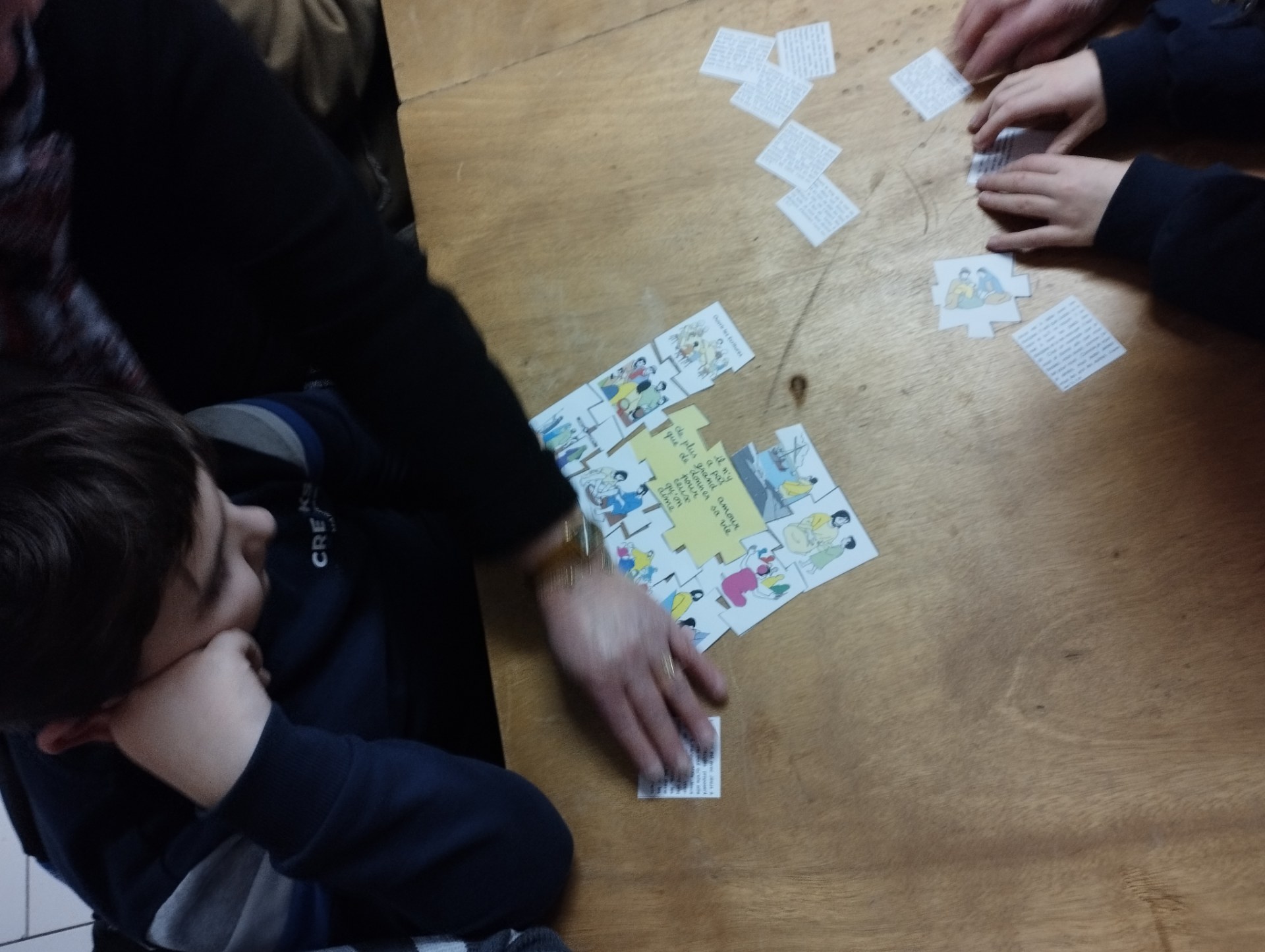 Au centre du puzzle, la parole de Jésus : « Il n’y a pas de plus grand amour que de donner sa vie pour ceux qu’on aime… » (Jn 15,13). Pour les parents, la réflexion se prolongeait autour du Christ nous montrant comment aimer, c'est-à-dire comment durer dans le service, dans le don de soi dans nos maisons et familles. …