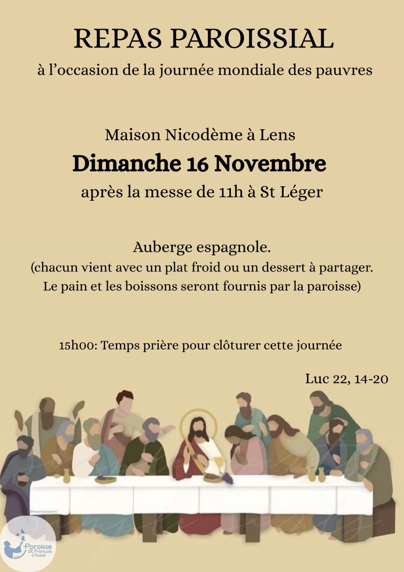Nous vous invitons à un repas paroissial le dimanche 16 novembre après la messe de 11h, à l'occasion de la journée mondiale des pauvres.