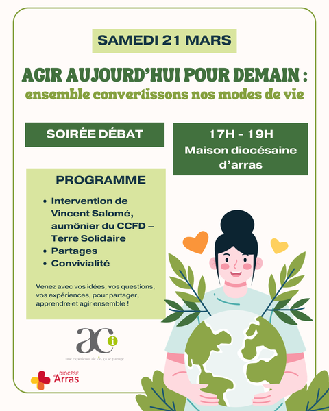 Une soirée débat est organisée par l’ACI (Action catholique des indépendants) sur le thème : Agir aujourd’hui pour demain - Ensemble, convertissons nos modes de vie.