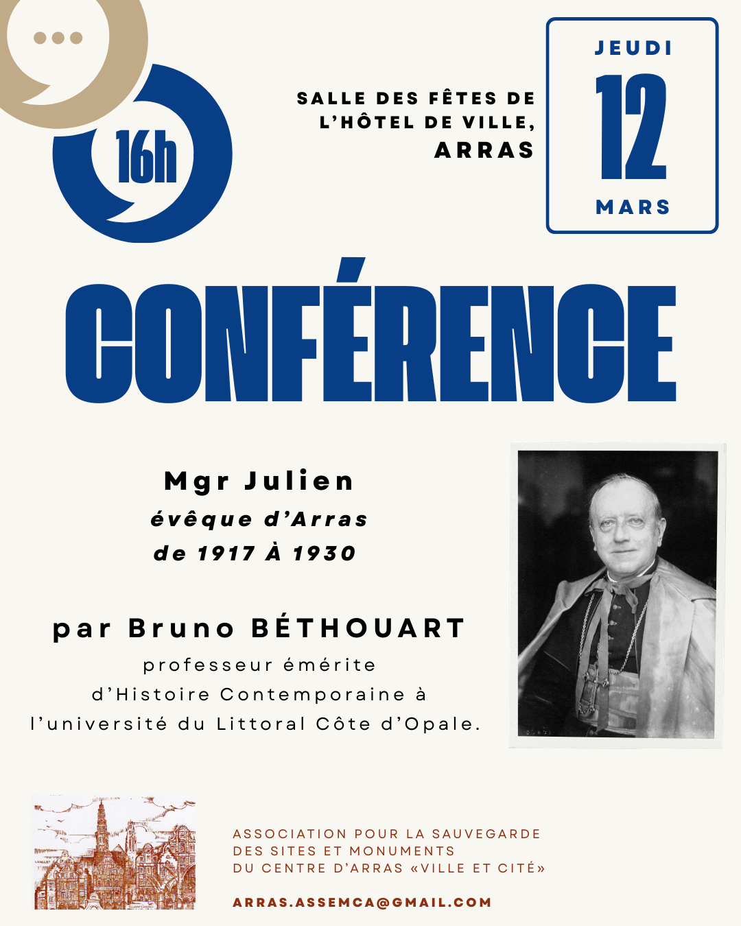 Une conférence se tiendra à la salle des fêtes de l’Hôtel de Ville d’Arras, place des Héros, à Arras, le jeudi 12 mars à 16h : « Mgr Julien, évêque d’Arras de 1917 à 1930 », donnée par Bruno Béthouart, professeur émérite d’histoire contemporaine à l’Université du Littoral Côte d’Opale.