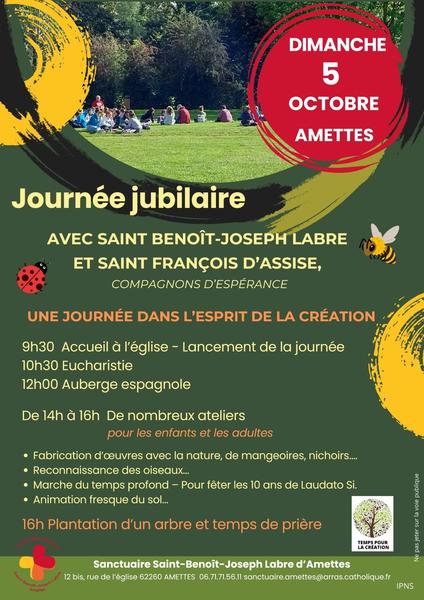 La création était au coeur de cette journée jubilaire. C'est Philippe, ami franciscain qui a lancé la journée par une méditation où il a mis en parallèle les parcours et spiritualité de saint François d'Assise et saint Benoît par rapport au thème de la journée et le mois de la création. "Jésus nous invite aujourd’hui à regarder la création : les oiseaux, les fleurs, la beauté simple du monde qui nous entoure. La nature est une école de confiance, une catéchèse silencieuse. Deux saints nous montrent comment vivre cette parole : saint François d’Assise et saint Benoît-Joseph Labre. Deux vies pauvres, mais remplies de lumière. Deux chemins différents, un seul amour : celui du Christ à travers la création....François avait ce regard pur qui reconnaît dans chaque créature une sœur sortie des mains de Dieu. La création devenait miroir de l’amour de Dieu.