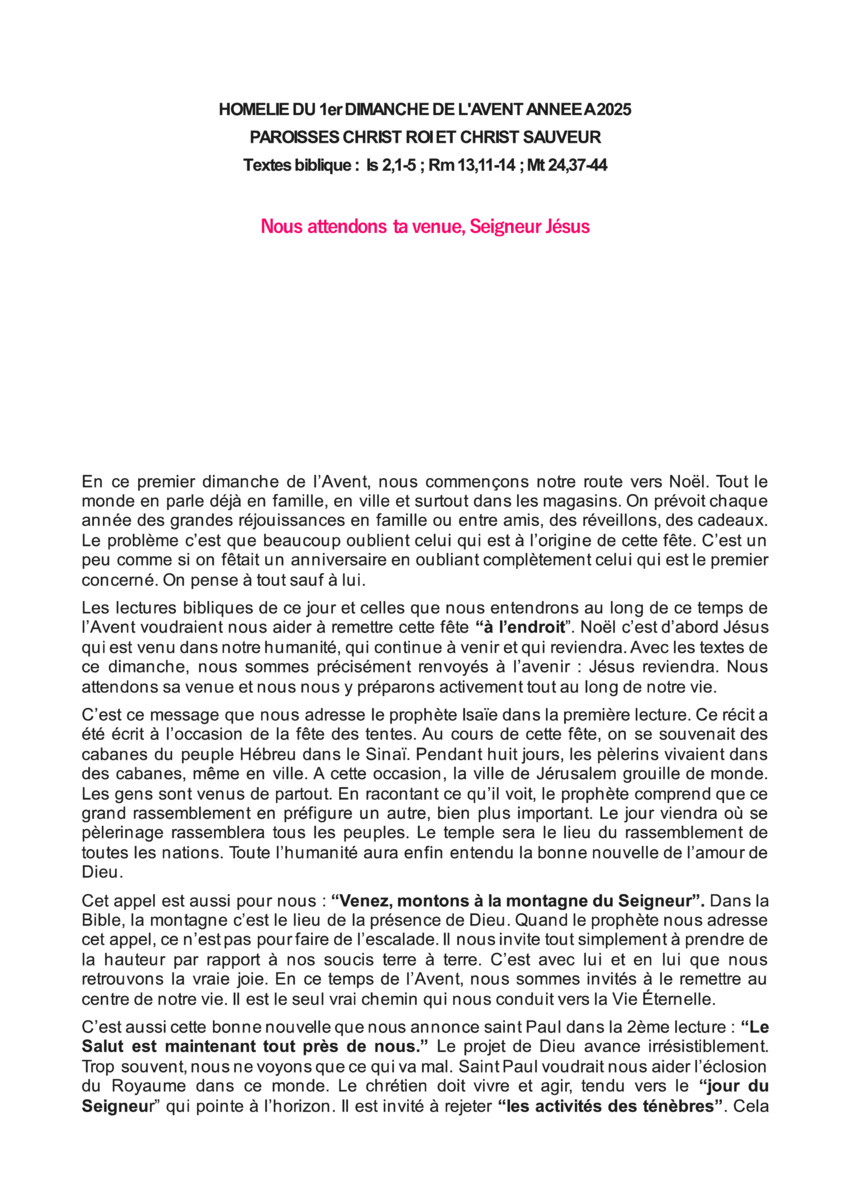 Retrouvez ci-dessous l'homélie du 1er dimanche de l'Avent Année A 2025 du Père José Marie NTUMBA