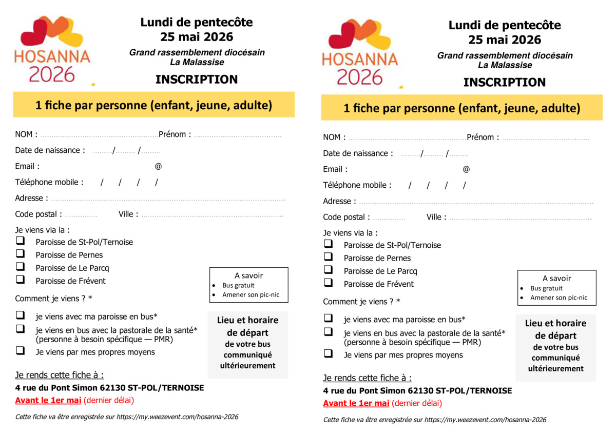 Ou aussi via le formulaire en ligne https://www.paroissesaintpaulenternois.com/hosanna-2026.html