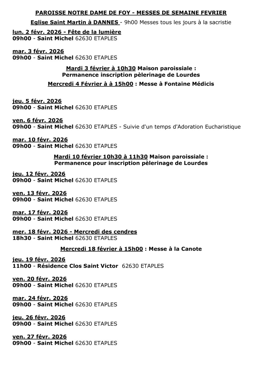 Eglise Saint Michel à Etaples : 9h00 Lundi 2 (Fête de la lumière) Mardi 3 Jeudi 5 - Vendredi 6 (suivie d'un temps d'Adoration Eucharistique)
