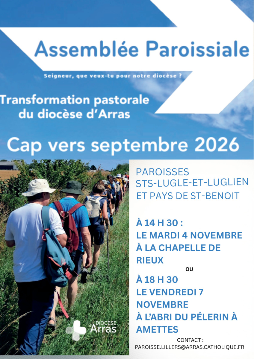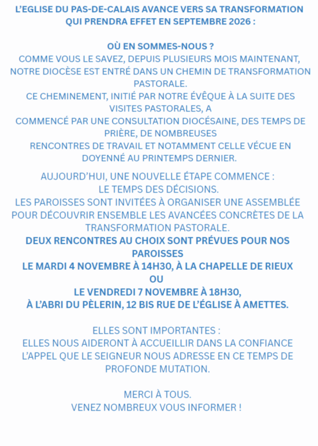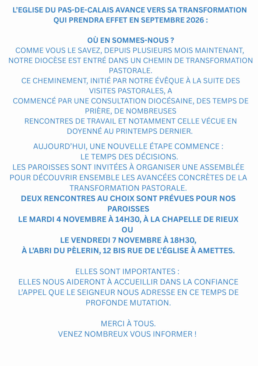 Invitation aux assemblées paroissiales Vers la transformation pastorale le Mardi 04 nov 2025 à la chapelle de Rieux (rue de la chapelle à Lillers) le Vendredi 07 nov 2025 à l'abri du pèlerin à Amettes (12 rue de l'église) invitation assemblees paroissiales 1 invitation assemblees paroissiale 2