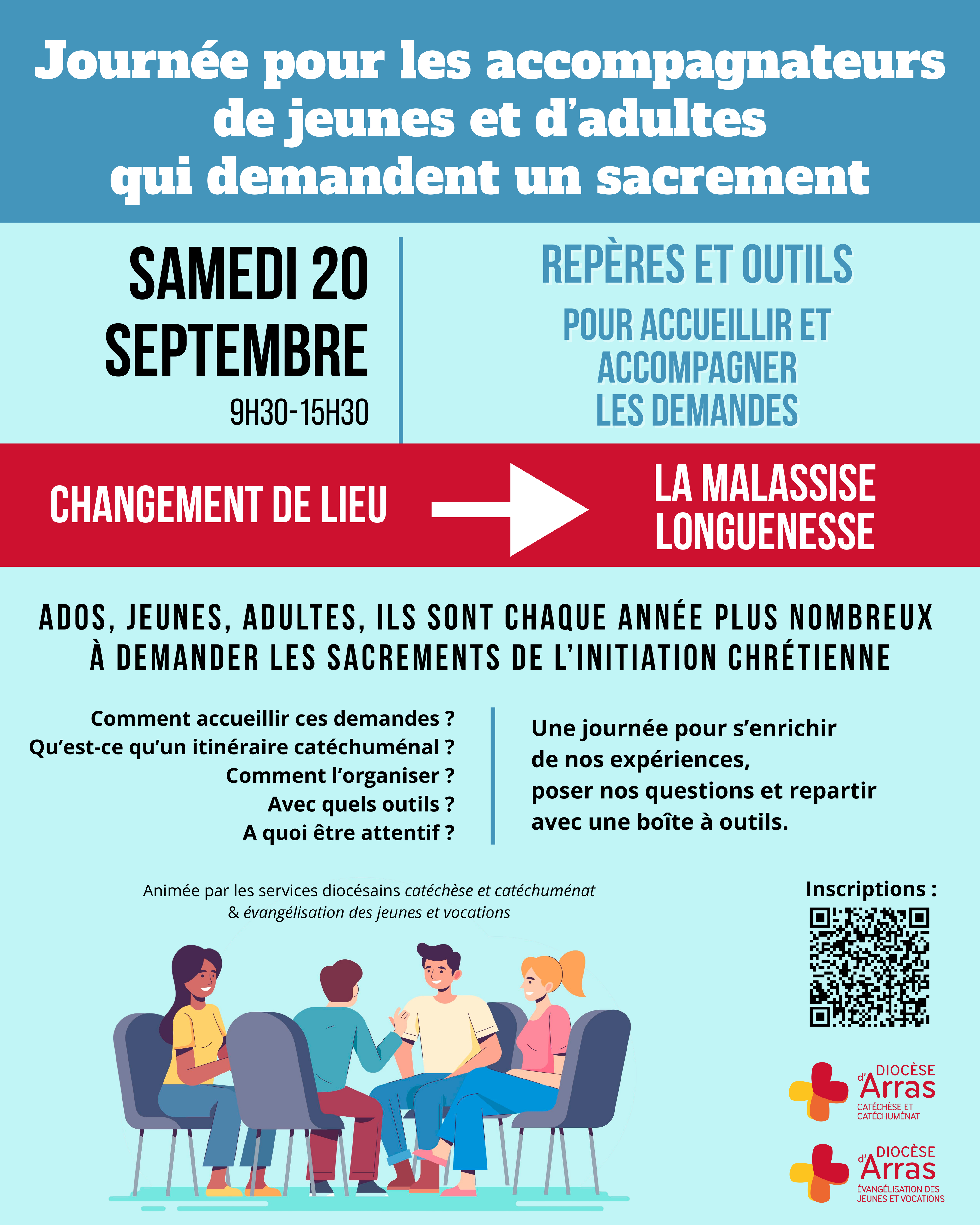 CHANGEMENT DE LIEU : la journée pour les accompagnateurs de jeunes et d'adultes qui demandent un sacrement, prévue ce samedi 20 septembre, se déroulera à la Malassise à Longuenesse