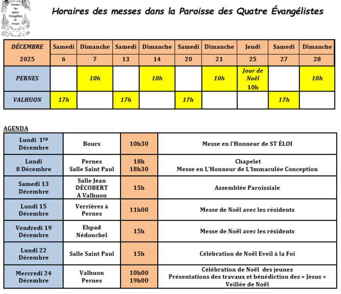 Lieux et horaires des offices de DECEMBRE 2025 Lieux et horaires des offices de DECEMBRE 2025 dans la paroisse des quatre évangélistes du Ternois Du Lundi 01 déc 2025 au Vendredi 02 jan dec 2025