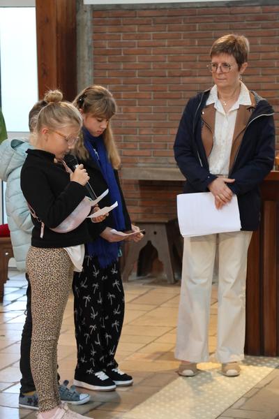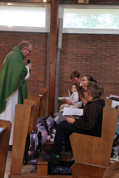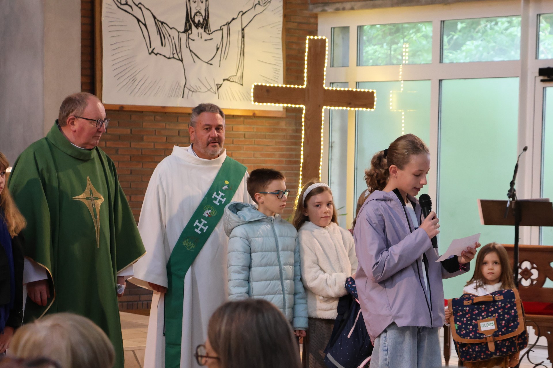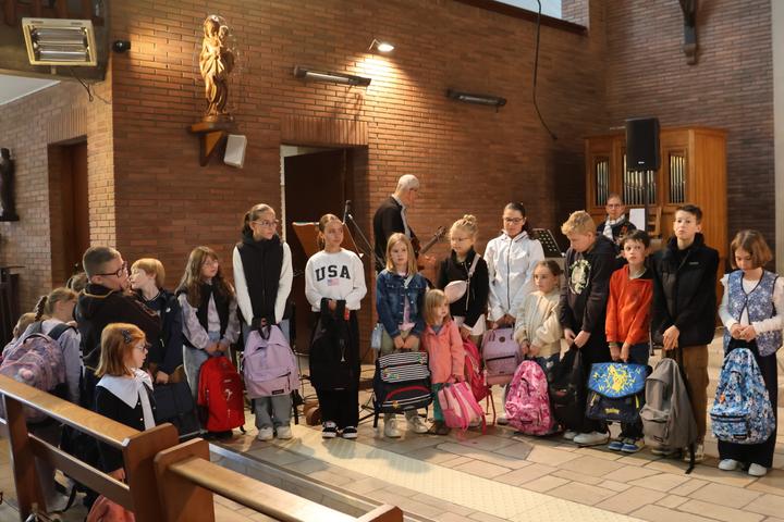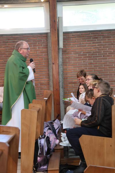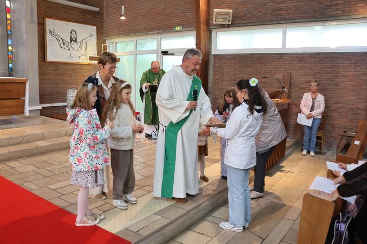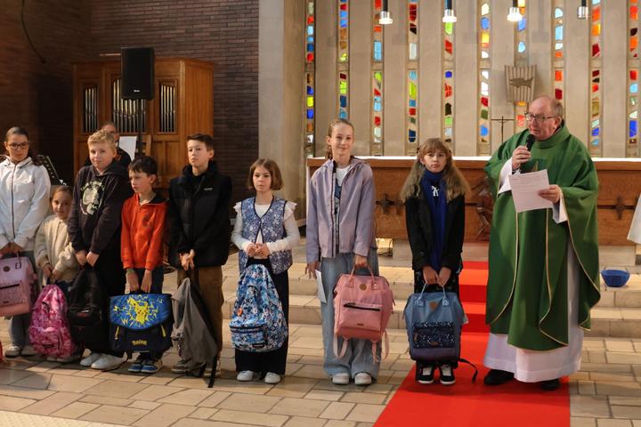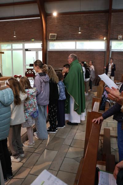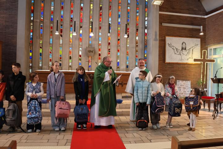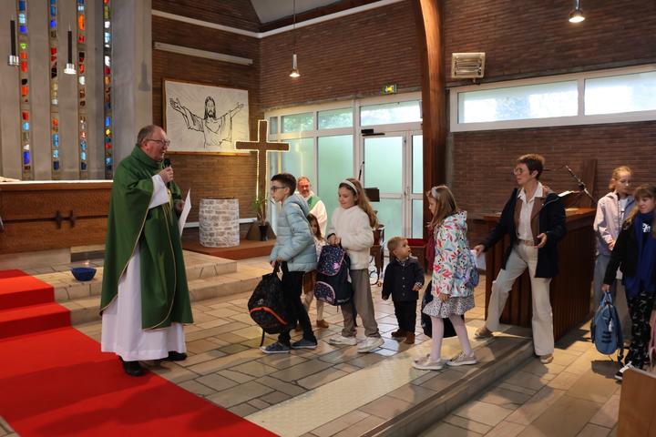 A la fin de la célébration eucharistique,l'Abbé fit venir les enfants dans le choeur avec leurs cartables