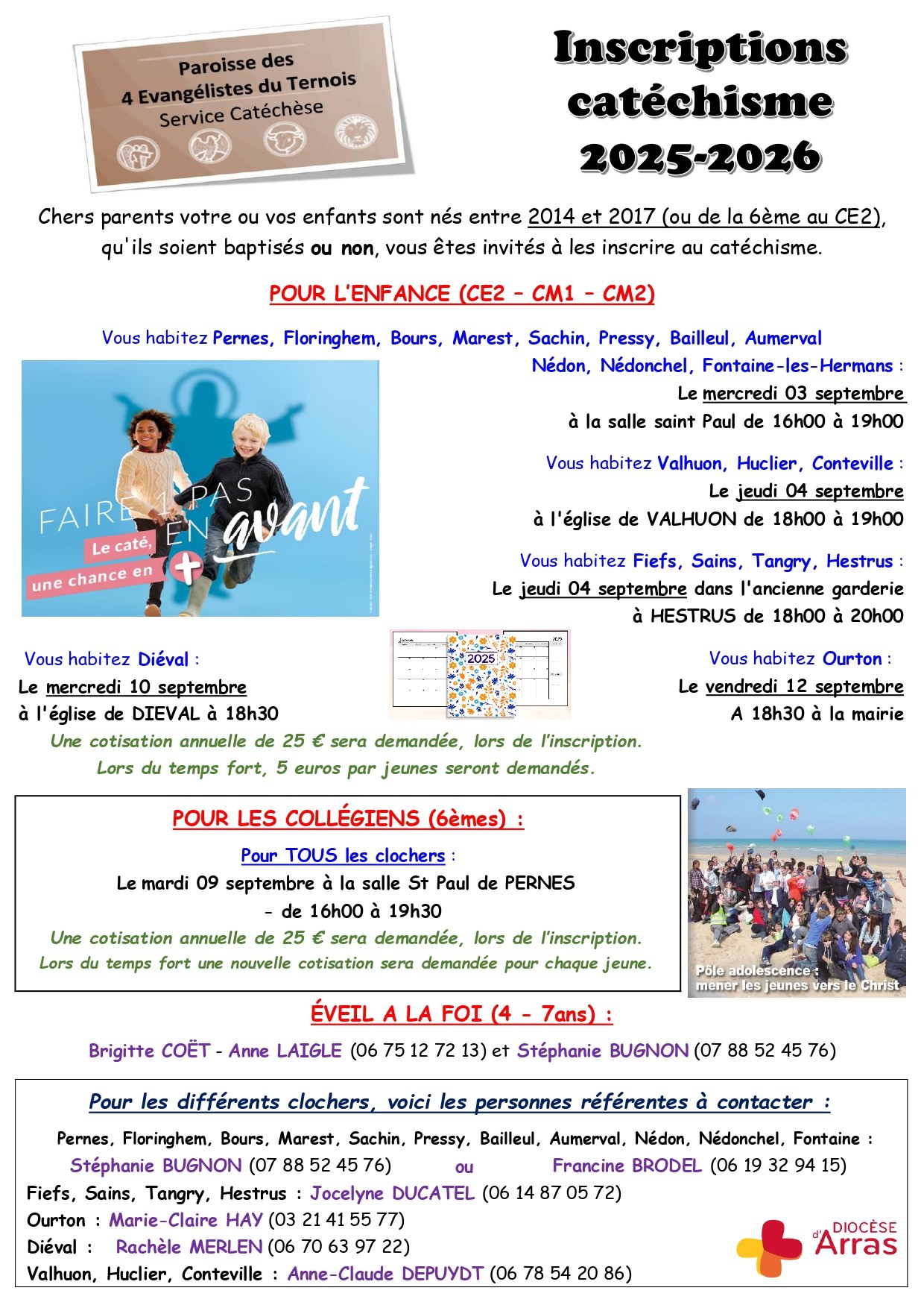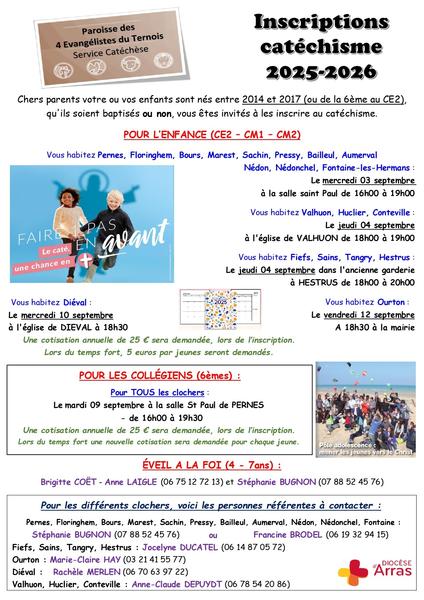 La catéchèse dans la Paroisse des Quatre Evangélistes du Ternois: Son esprit, son déroulement, les personnes à contacter, les dates des cérémonies et des messes des familles.