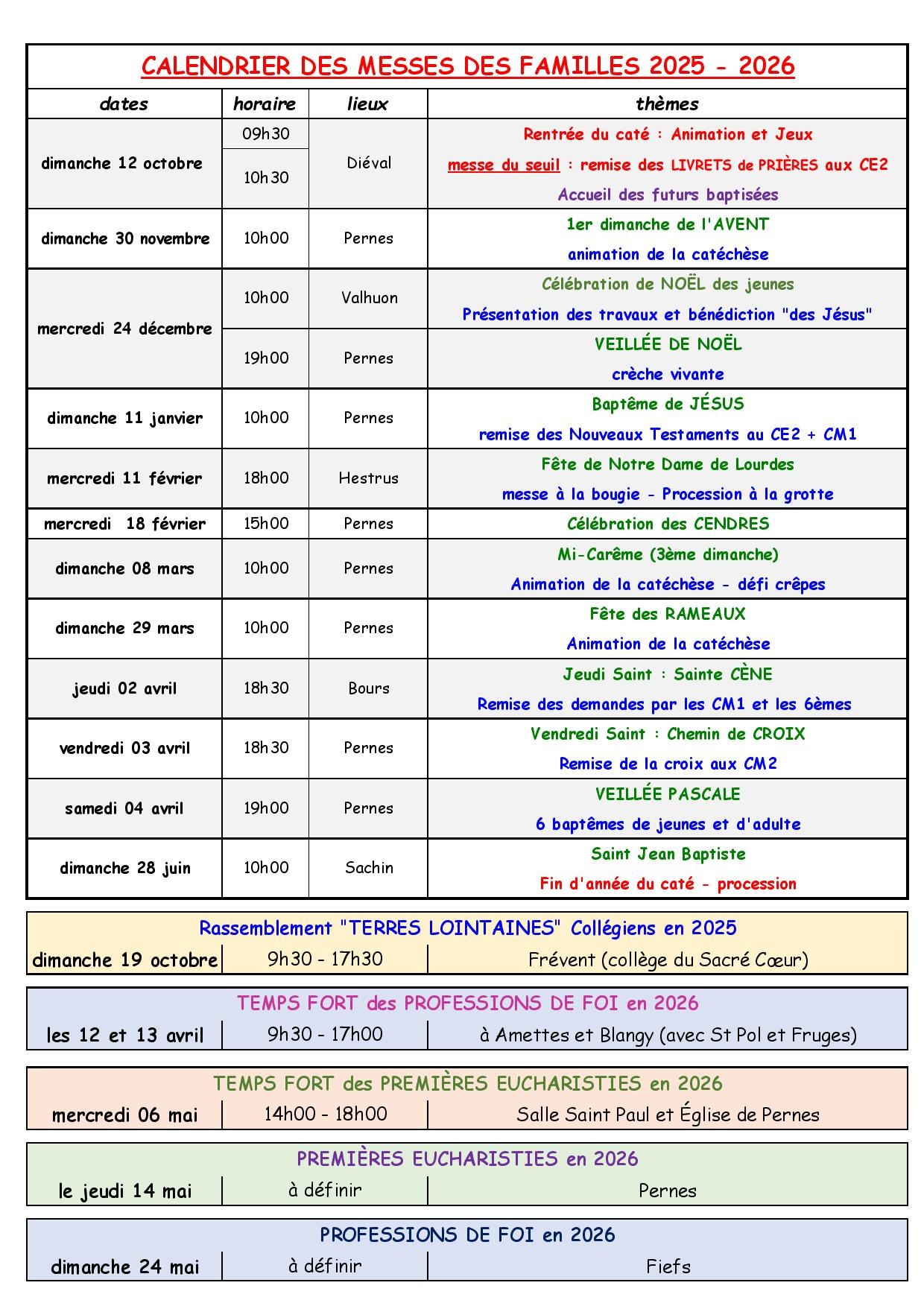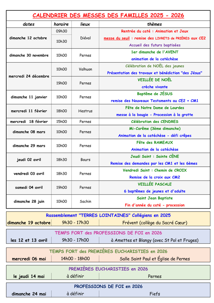 Dates des Messes des Familles, des Premières Eucharistie, des Professions de Foi, et des Retraites pour l'année 2025-2026