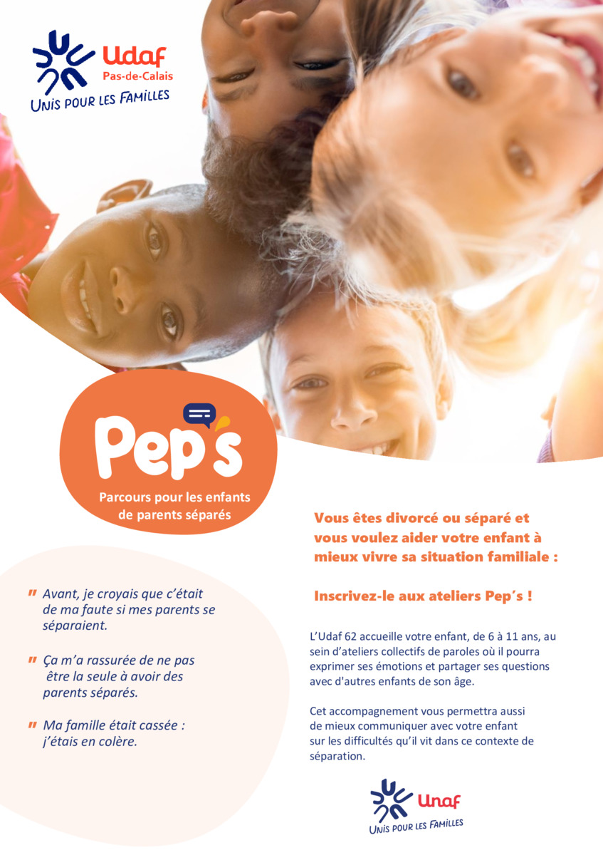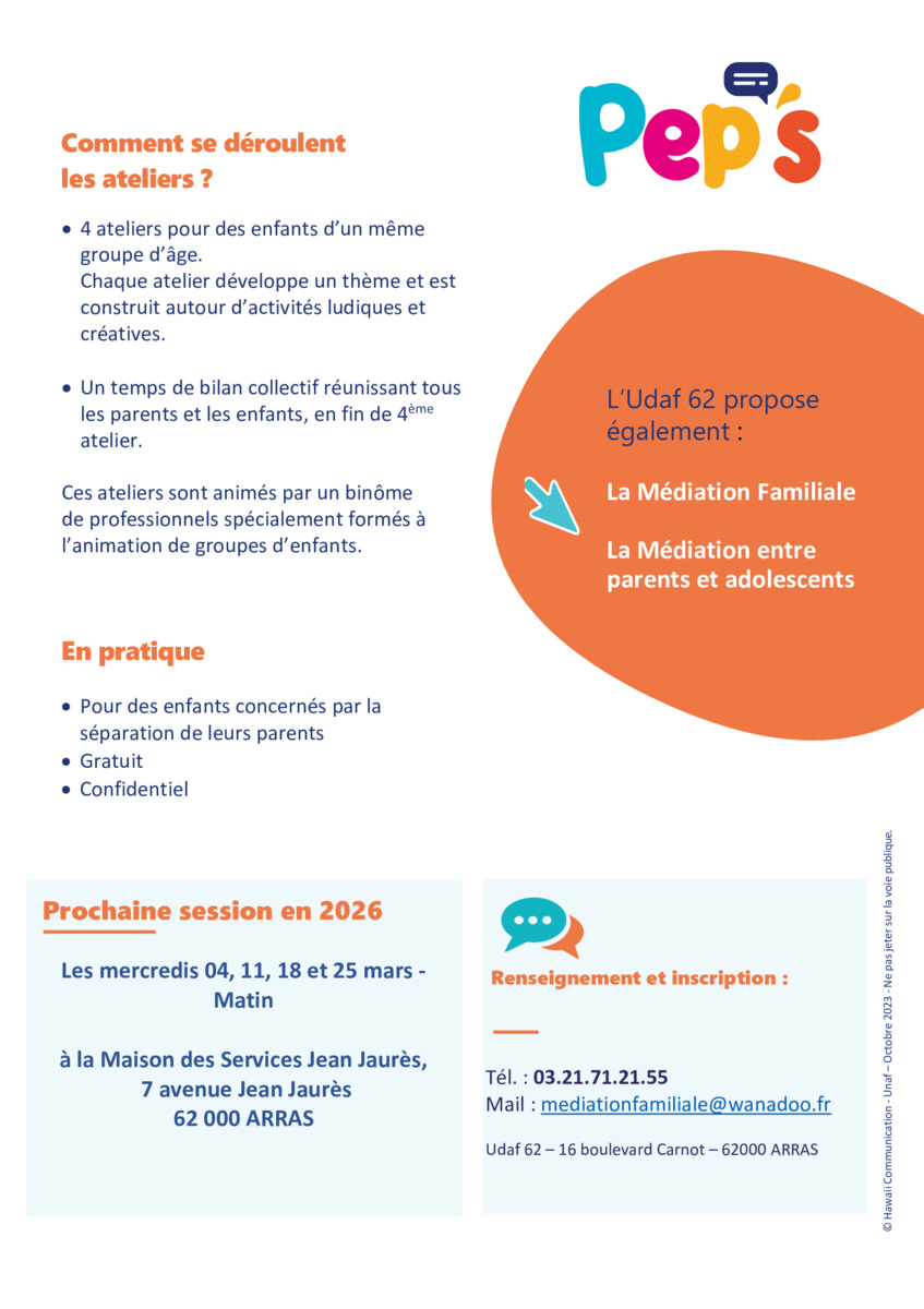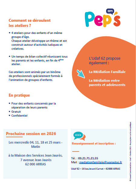 L'union départementale des associations familiales UDAF62, vous informe que la prochaine session des ateliers PEP’S se déroulera, en collaboration avec le Centre Social Arras Sud, les mercredis matin 4, 11, 18 et 25 mars 2026, à la Maison des Services, 7 avenue Jean Jaurès à Arras.