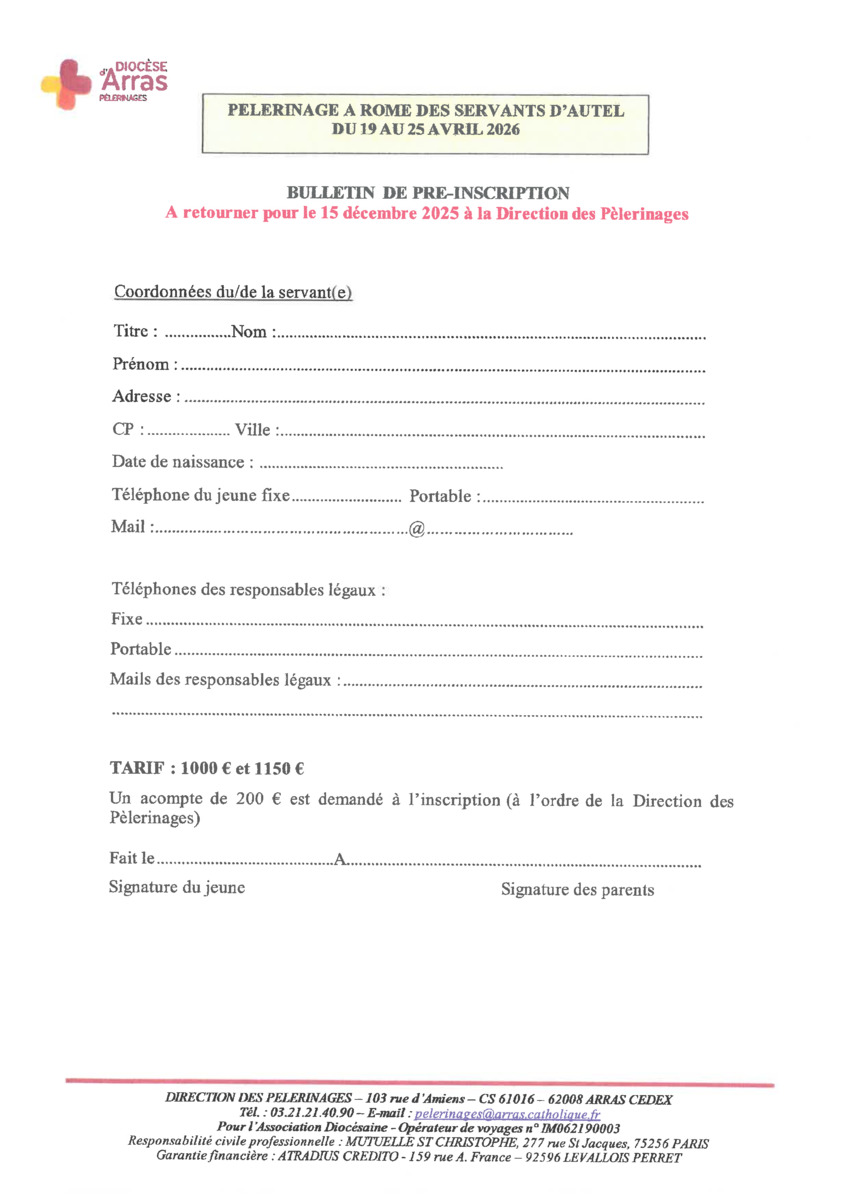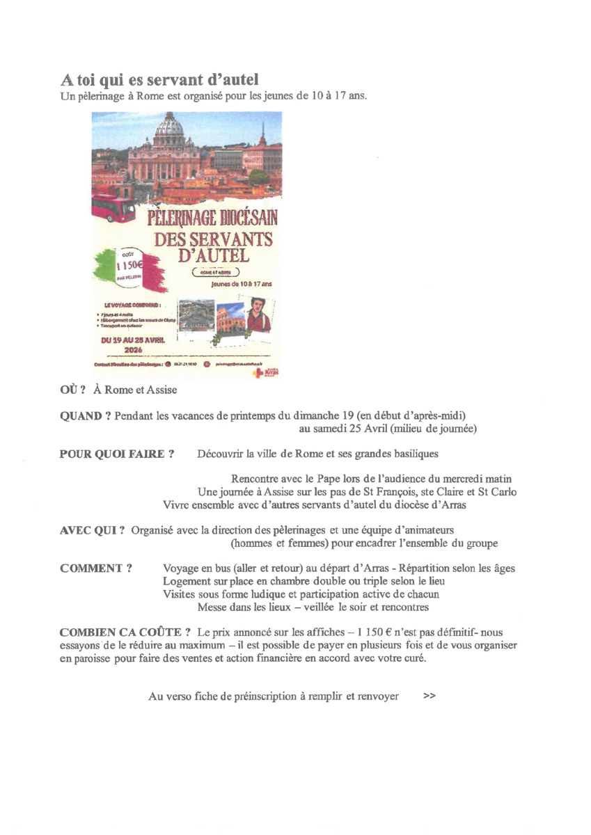 Pèlerinage à Rome et Assise en autocar pour les servants d'autel de 10 à 17 ans - bulletin de pré-inscription
