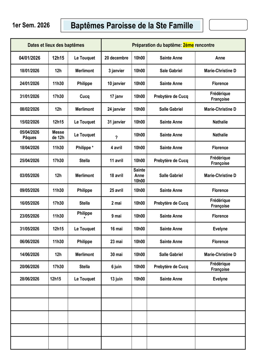 Plannings baptêmes 2ème 2025 et 1er semestre 2026 - Paroisse de la Sainte Famille Du Dimanche 12 oct 2025 au Mardi 30 juin
