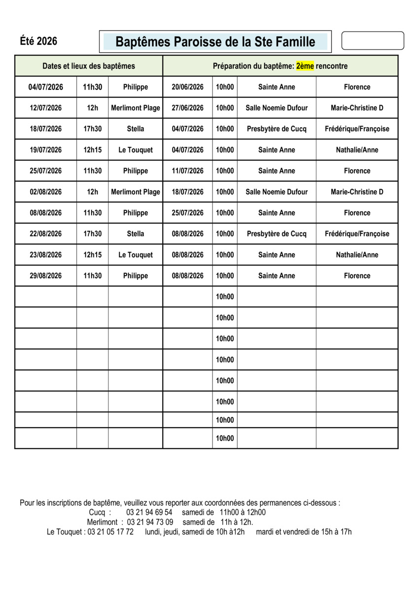 Planning baptêmes 1er et 2ème semestres 2026 - Paroisse de la Sainte Famille Du Jeudi 01 jan au Samedi 29 août