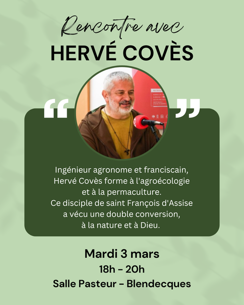 La Paroisse St Pierre sur l’Aa organise le mardi 3 mars, de 18h à 20h, à la salle Pasteur de Blendecques, une rencontre avec Hervé Covès.