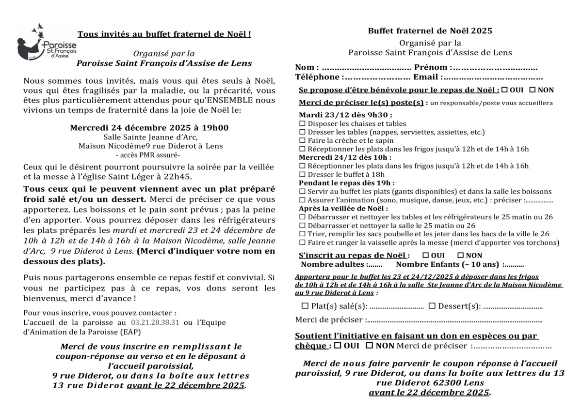 Les réservations sur les tracts sont à rendre avant le 22/12 dans la boite aux lettres de la paroisse 9 rue Diderot.