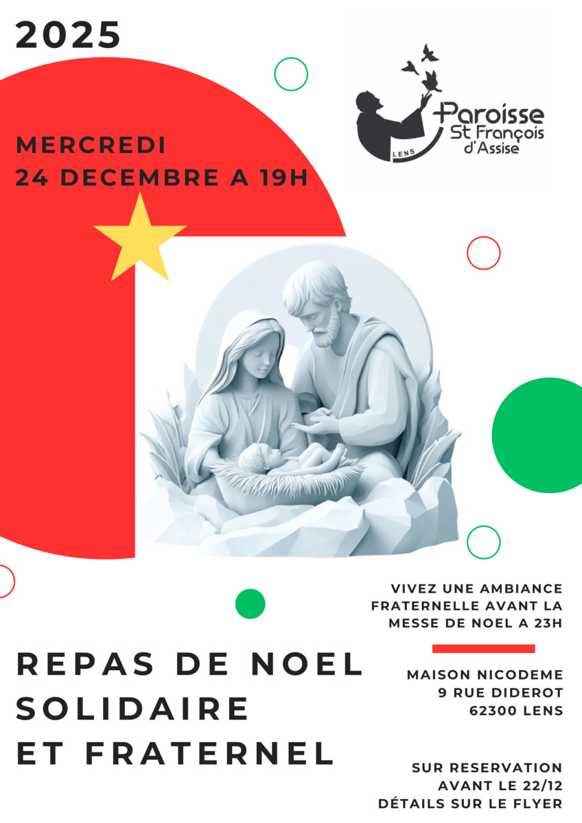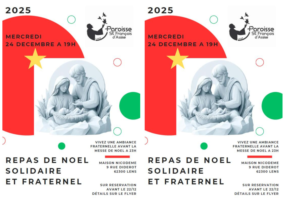 Ci-joint pour diffusion l'invitation au repas solidaire de Noel 2025 à la paroisse