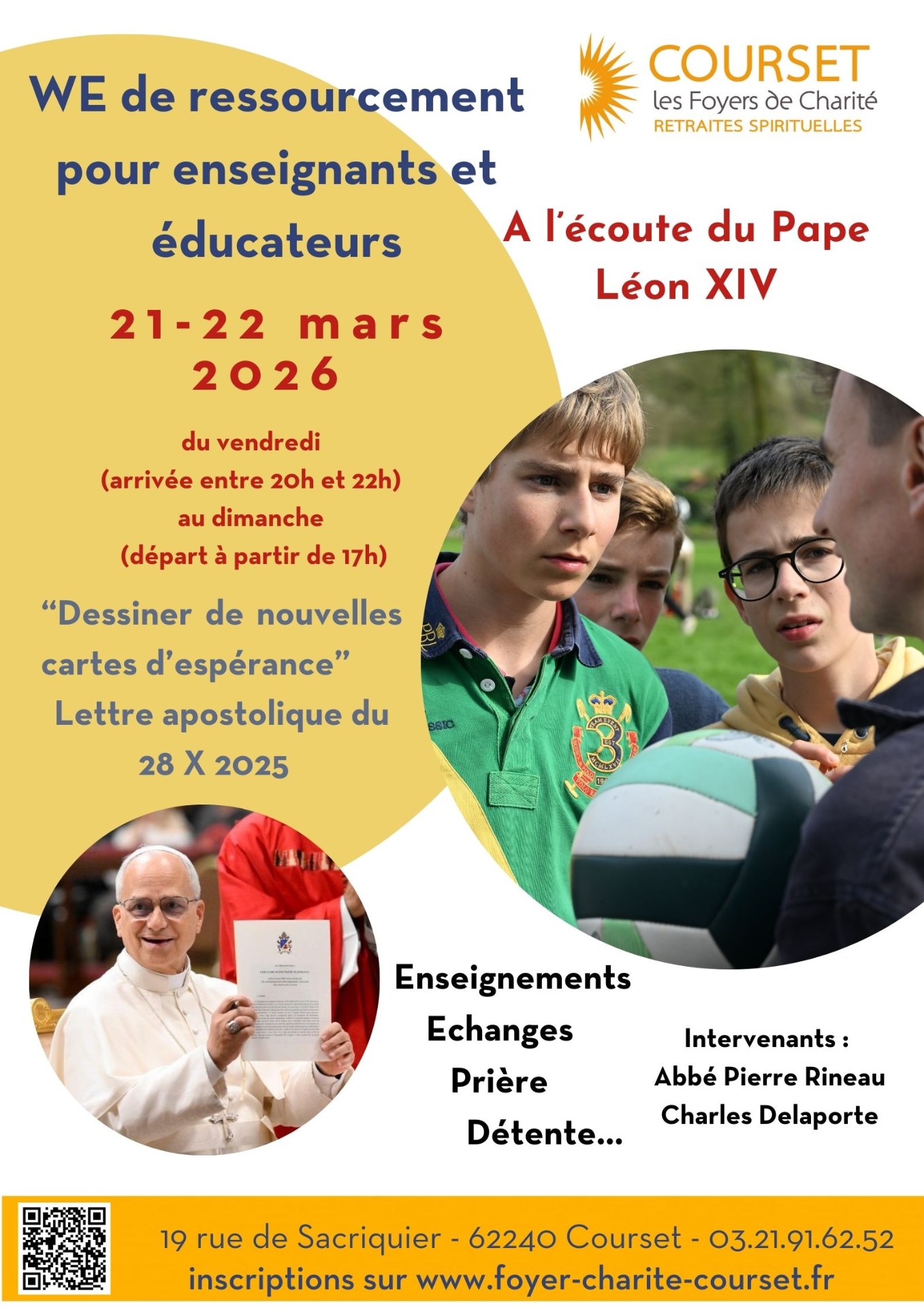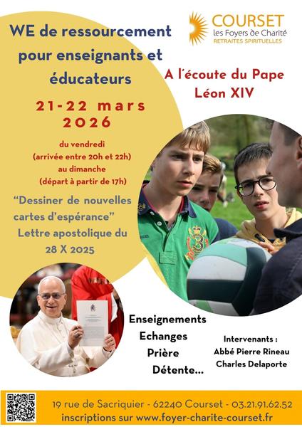 Vous consacrez votre quotidien à transmettre et à accompagner les jeunes ? Offrez-vous une pause spirituelle et humaine au cœur du Pas-de-Calais. Le Foyer de Charité de Courset vous invite à un week-end de réflexion et de détente les 21 et 22 mars 2026.