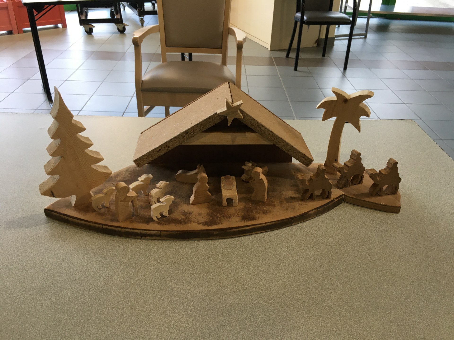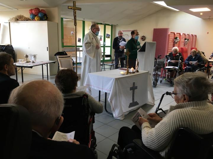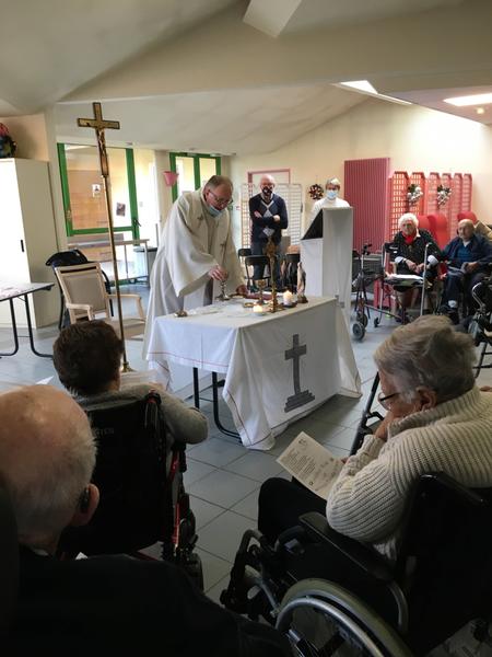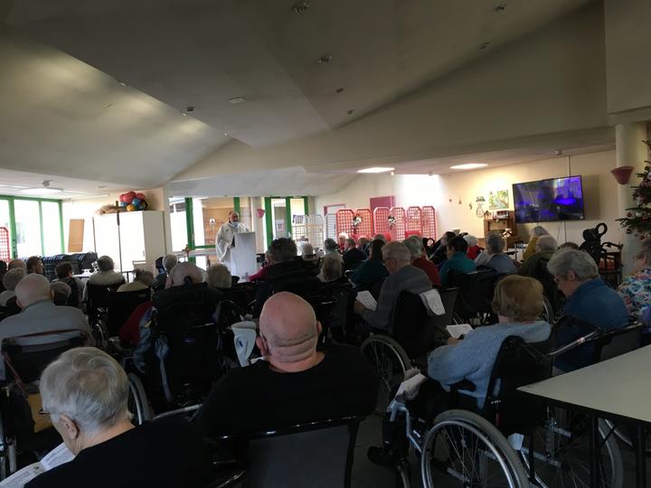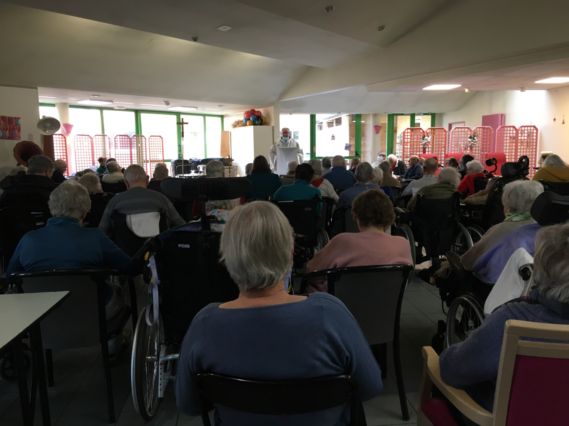 Les résidents attendaient patiemment que les membres du personnel, très coopératif, et les membres de l’aumônerie les conduisent afin de participer à la messe de Noël proposée par l’Abbé. Bernard et Marie Pierre étaient venus soutenir les chants repris en chœur par les nombreux participants…