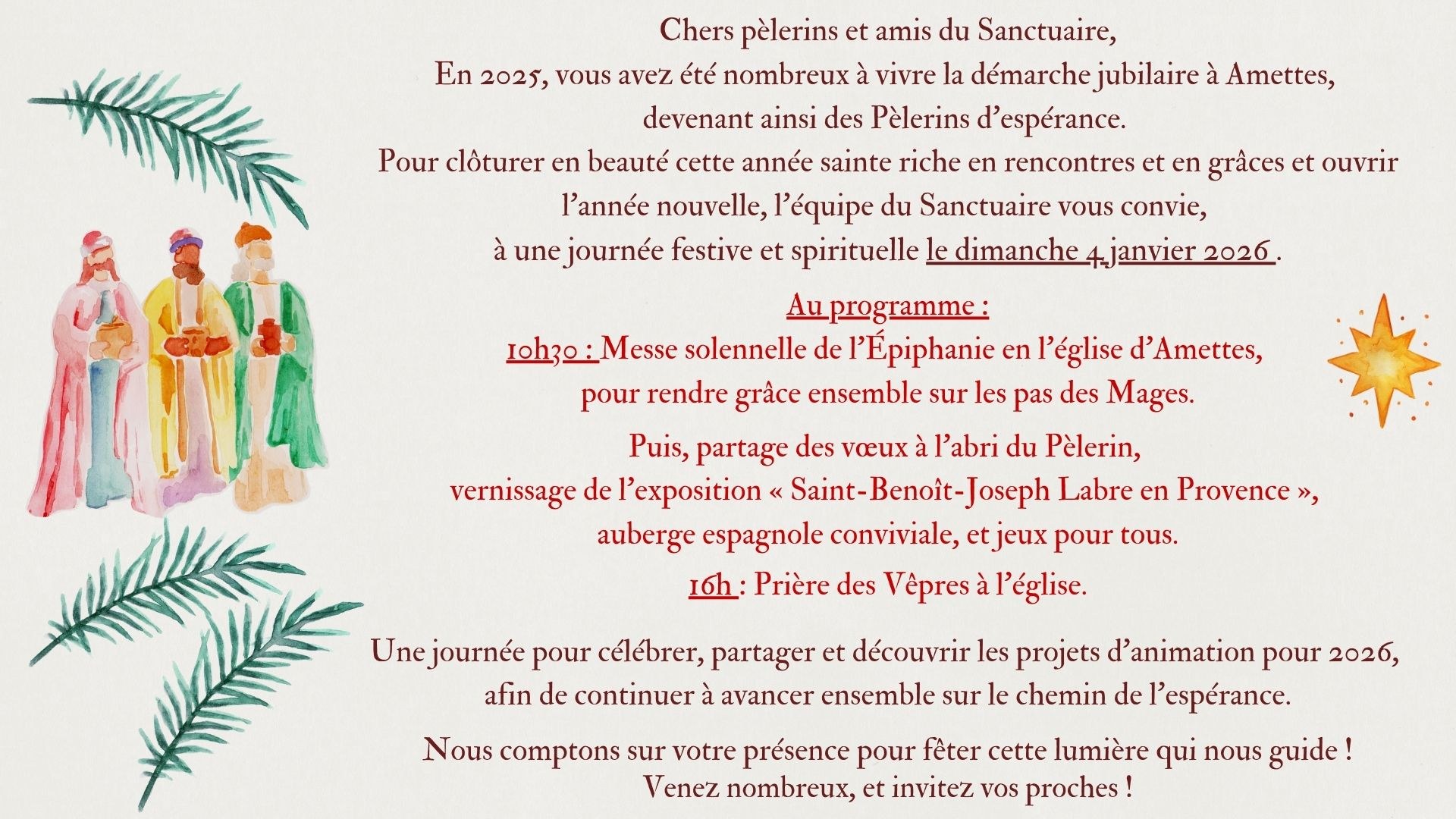 Venez fêter l'Epiphanie au Sanctuaire d'Amettes Une journée pour célébrer, partager et découvrir les projets d’animation pour 2026, afin de continuer à avancer ensemble sur le chemin de l’espérance. le Dimanche 04 jan 2026 Invitation Epiphanie