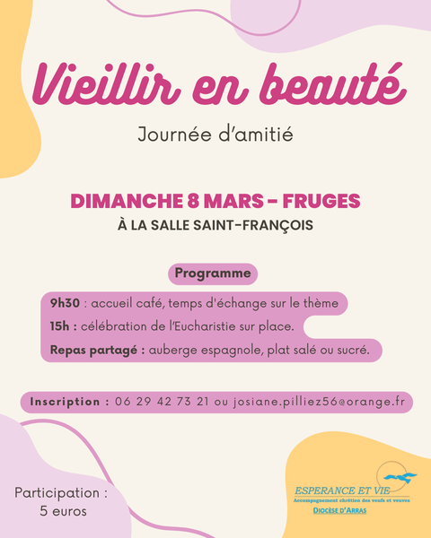 Le mouvement Espérance et Vie vous invite à vivre une journée d’amitié sur le thème “Vieillir en beauté”, le dimanche 8 mars 2026 à Fruges (Salle Saint François - près de l'église, 2 rue du doyen).