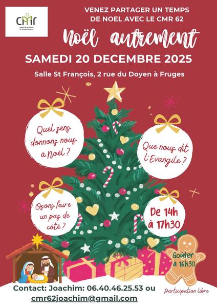 Quel sens donnons-nous à Noël ? Que nous dit l'Évangile ? Osons faire un pas de côté ! Venez partager un temps de Noël avec le CMR 62, le samedi 20 décembre 2025 à partir de 14h jusqu'à 17h30. Rendez-vous à la salle paroissiale de Fruges qui se trouve : Salle St François, 2 rue du Doyen.