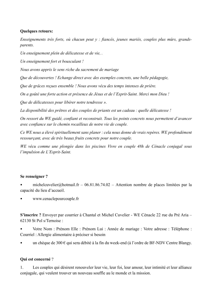 S’inscrire ? Envoyer par courrier à Chantal et Michel Cuvelier - WE Cénacle 22 rue du Pré Aria – 62130 St Pol s/Ternoise :