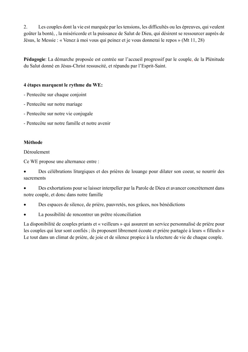 Pédagogie: La démarche proposée est centrée sur l’accueil progressif par le couple, de la Plénitude du Salut donné en Jésus-Christ ressuscité, et répandu par l’Esprit-Saint.
